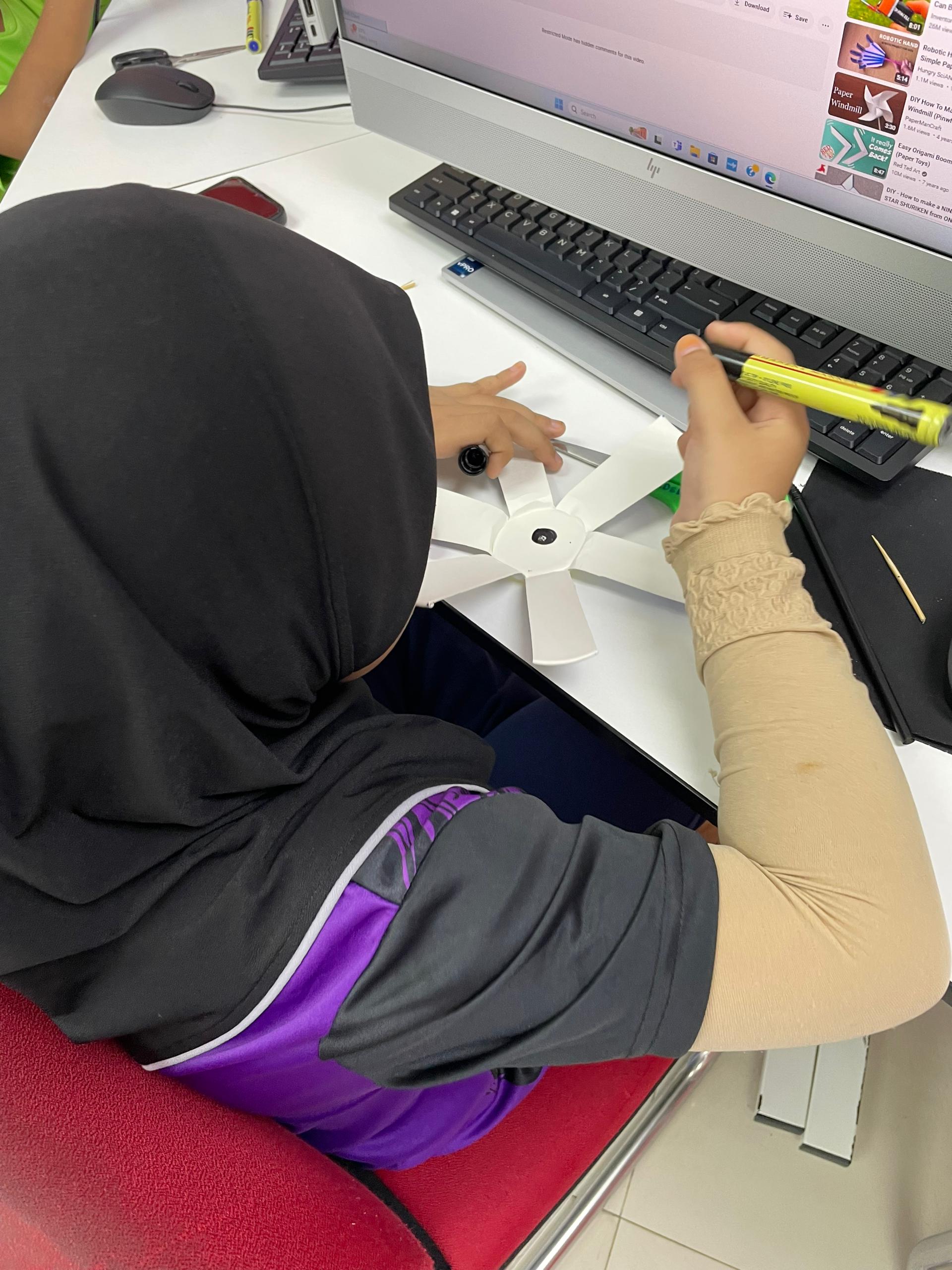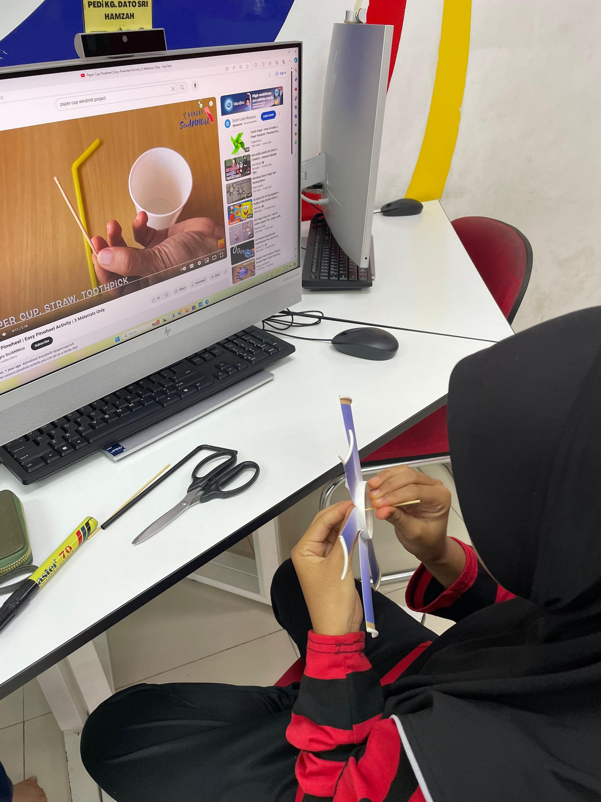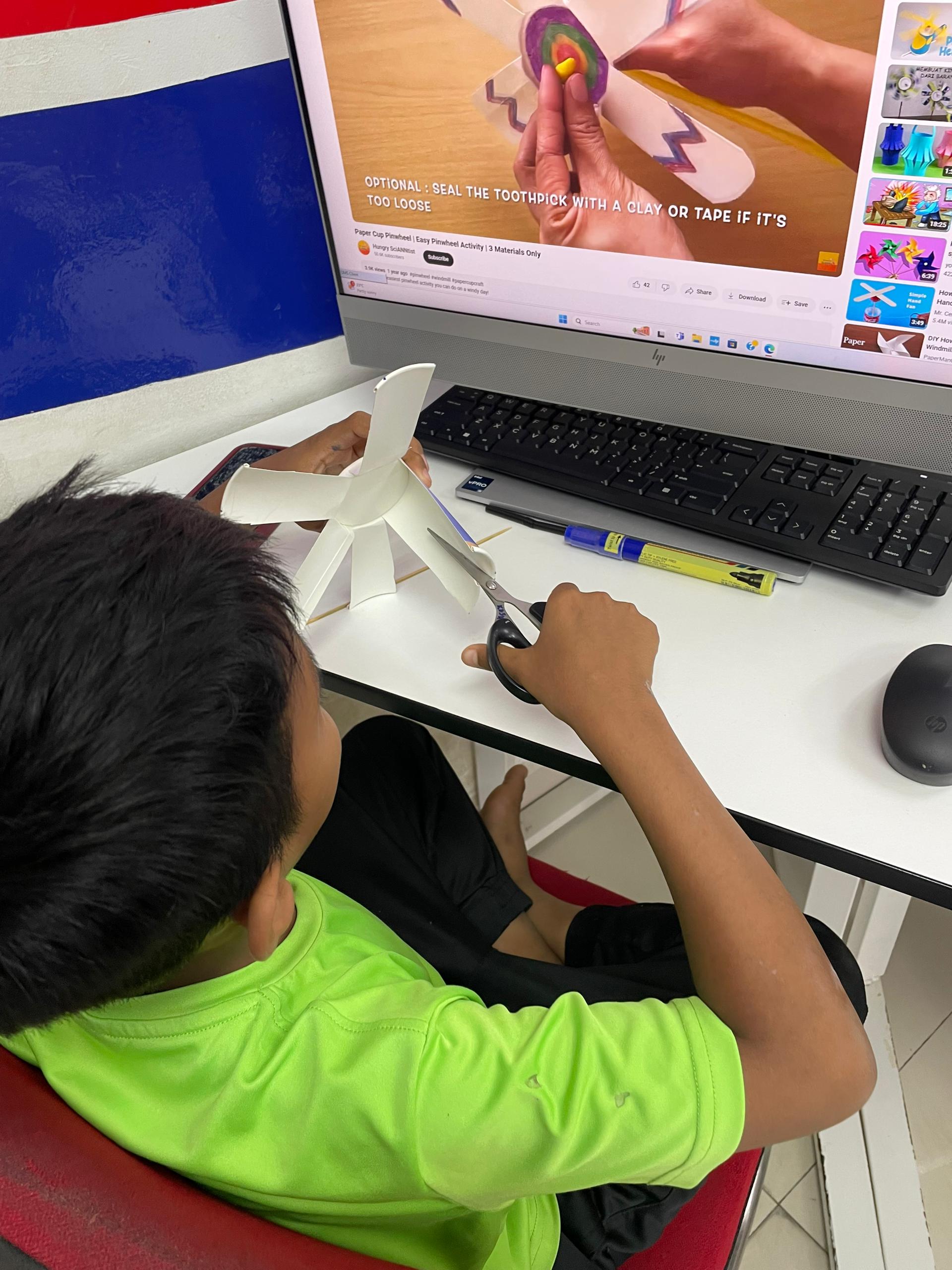 Peserta diminta untuk melihat cara-cara untuk membuat papercup pin wheel di youtube. Peserta diberikan bahan-bahan untuk membuat aktiviti tersebut. Peserta perlu menyiapkan aktiviti tersebut dan memastikan paper cup pin wheel tersebut berfungsi dengan baik.